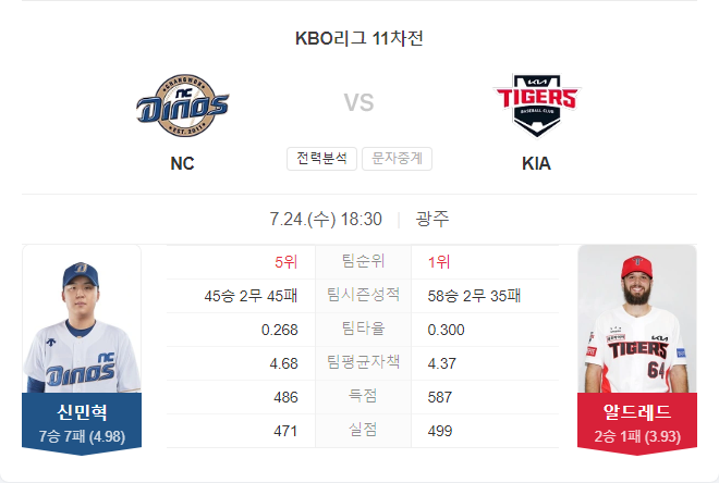 NC 다이노스는 이번 시즌 다소 어려움을 겪고 있는 팀 중 하나입니다. 평균자책점 6.55와 타율 0.257로 투수진과 타격에서 모두 어려움을 겪고 있습니다. 선발투수 신민혁은 올 시즌 7승 7패, 평균자책점 4.98, WHIP 1.38을 기록하고 있으며, 주로 체인지업(40.8%)과 커터(30.2%)를 사용하여 타자들을 상대합니다. 하지만 KIA 타이거즈를 상대로는 1패를 기록하고 있어 이번 경기에 대한 부담이 클 것입니다.