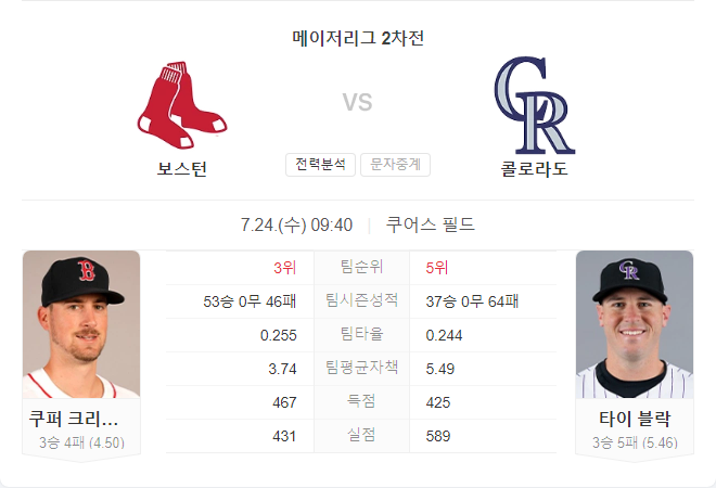 이번 경기는 보스턴 레드삭스의 공격력과 콜로라도 로키스의 투수진이 맞붙는 경기로 예상됩니다. 크리스웰과 블락 모두 안정적인 투구를 보여주지 못하고 있는 상황에서, 양 팀 모두 다득점을 기대할 수 있습니다. 특히, 보스턴은 최근 강력한 타격을 보여주고 있어 콜로라도의 투수진을 공략할 가능성이 높습니다. 따라서 보스턴 레드삭스가 이번 경기에서 유리할 것으로 보입니다.