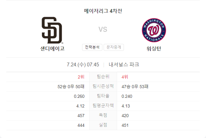 7월 24일 MLB 샌디에이고 파드리스 VS 워싱턴 내셔널스 타카짱의 경기 예측 분석