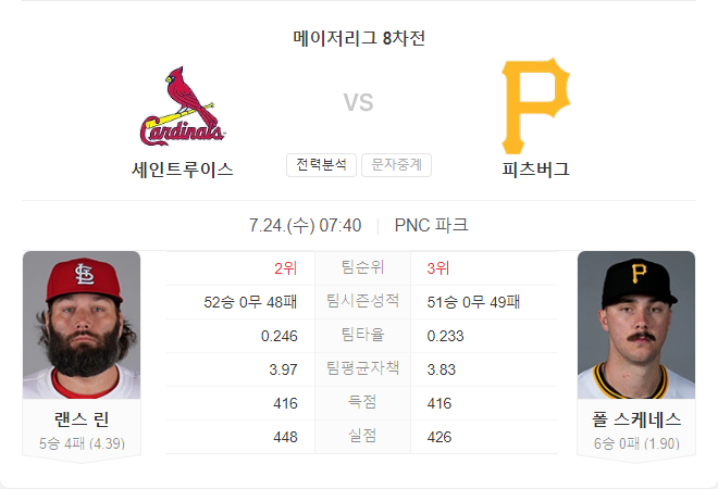 이번 경기는 세인트루이스 카디널스의 경험 많은 선발 투수와 피츠버그 파이어리츠의 신예 투수의 대결입니다. 스켄스의 강력한 투구와 홈 경기의 이점을 살릴 수 있는 피츠버그가 우세할 것으로 예상됩니다. 세인트루이스의 타선이 강하긴 하지만, 스켄스의 최근 폼을 감안하면 피츠버그가 승리할 가능성이 높습니다.