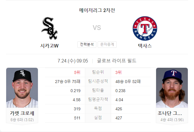 화이트삭스는 이번 시즌 전반적으로 부진한 모습을 보이고 있지만, 가렛 크로셰가 선발 등판하는 오늘 경기는 다를 수 있습니다. 크로셰는 최근 좋은 투구를 보여주고 있으며, 레인저스 타선을 잘 막아낼 가능성이 큽니다. 반면, 레인저스는 최근 타선이 다소 부진하지만, 홈 경기에서의 성적은 나쁘지 않습니다. 하지만, 오늘 경기는 크로셰의 투구에 의해 결정될 가능성이 높아 보입니다.