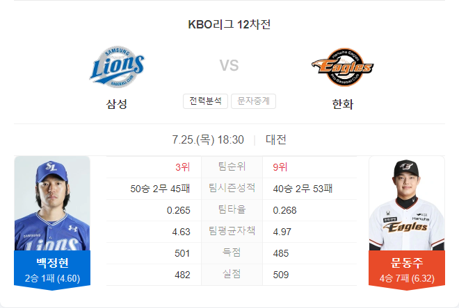 한화 이글스는 올 시즌 평균자책점 4.31, 팀 타율 0.275, 평균 득점 4.8점, 평균 실점 4.3점으로 나쁘지 않은 성적을 보이고 있습니다. 선발 투수 문동주는 6.32의 평균자책점과 4승 7패를 기록하고 있으며, 주된 구종은 직구(49.6%)와 커브(25.8%)입니다. 그의 평균 구속은 직구 149.8km/h, 커브 122.3km/h로, 강한 직구와 효과적인 커브로 타자들을 압도하려 합니다.