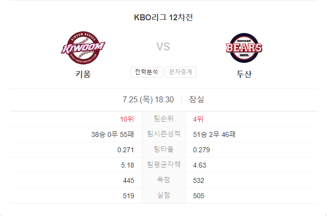 7월 25일 KBO 프로야구 키움 히어로즈 VS 두산 베어스 타카짱의 경기 예측 분석
