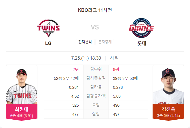 LG 트윈스는 이번 시즌에서 평균자책점 3.66, 팀 타율 0.305, 평균 득점 5.6점으로 매우 우수한 성적을 내고 있습니다. 선발 투수 최원태는 3.91의 평균자책점과 6승 4패를 기록하며 팀의 에이스 역할을 하고 있습니다. 그의 주된 구종은 직구(30.8%)와 슬라이더(28.4%)이며, 평균 구속은 각각 143.7km/h와 136.4km/h입니다. 체인지업(16.2%)과 커브(12.1%)도 구사하며 다양한 공을 던집니다.