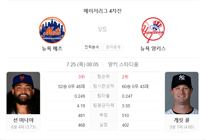 7월 25일 MLB 뉴욕 메츠 VS 뉴욕 양키스 타카짱의 경기 예측 분석