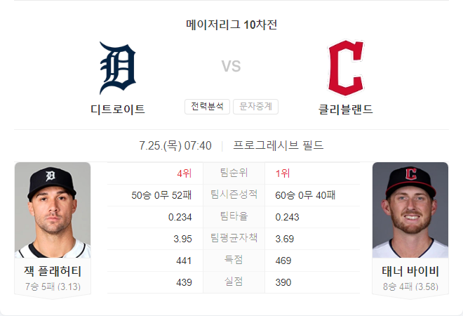 디트로이트 타이거즈는 최근 경기에서 좋은 성적을 거두고 있으며, 클리블랜드 가디언스를 상대로도 좋은 성적을 기록하고 있습니다. 잭 플래허티는 이번 시즌 클리블랜드를 상대로 두 경기에서 평균자책점 2.25를 기록하며 안정적인 모습을 보였습니다. 반면 타너 비비는 디트로이트를 상대로 두 경기에서 평균자책점 6.55를 기록하며 다소 부진한 모습을 보였습니다. 디트로이트가 이번 경기에서도 승리할 가능성이 높아 보입니다.