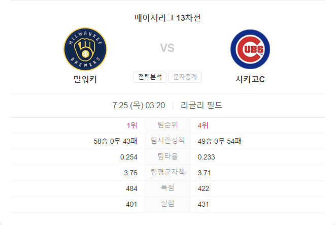 7월 25일 MLB 밀워키 브루어스 VS 시카고 컵스 타카짱의 경기 예측 분석