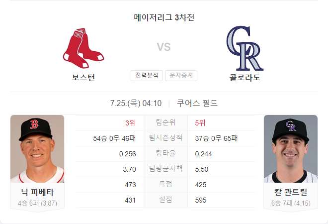 보스턴 레드삭스는 최근 경기에서 타선은 잘 유지하고 있지만, 투수진이 흔들리며 어려움을 겪고 있습니다. 닉 피베타는 최근 경기에서 좋은 모습을 보였지만, 콜로라도 로키스를 상대로는 고전해왔습니다. 반면, 콜로라도 로키스는 최근 좋은 흐름을 유지하고 있으며, 홈에서 강한 모습을 보이고 있습니다. 칼 콴트릴 역시 최근 몇 경기에서 다소 부진했지만, 홈에서의 안정적인 투구를 기대할 수 있습니다. 이번 경기는 콜로라도 로키스가 홈에서 우위를 점할 가능성이 높습니다.