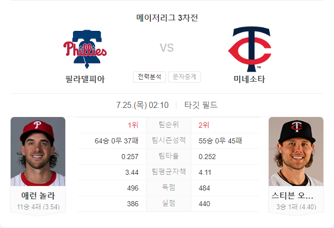 7월 25일 MLB 필라델피아 필리스 VS 미네소타 트윈스 타카짱의 경기 예측 분석