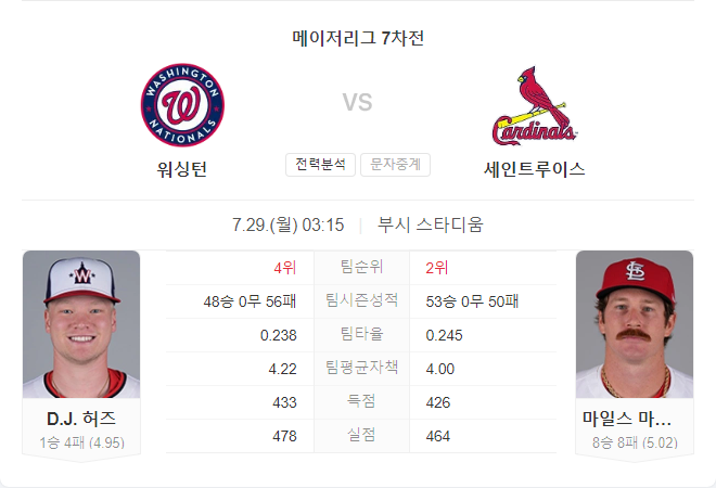 디제이 헤르츠는 이번 시즌 기복 있는 모습을 보이고 있으며, 세인트루이스 카디널스를 상대로 한 유일한 등판에서 부진한 성적을 기록했습니다. 반면, 마일스 마이콜라스는 최근 안정적인 투구를 보여주고 있으며, 내셔널스를 상대로 좋은 성적을 기록한 경험이 있습니다. 홈 경기에서 마이콜라스의 안정적인 투구와 카디널스의 공격력을 고려할 때, 이번 경기는 세인트루이스 카디널스가 우세할 것으로 보입니다.