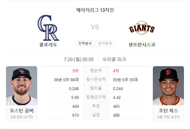 자이언츠는 이번 시리즈 마지막 경기에서 조던 힉스를 선발로 내세울 예정입니다. 힉스는 이번 시즌 20경기에서 4승 7패, 평균자책점 4.01을 기록 중입니다. 그는 최근 5경기에서 팀이 모두 패배하며 어려움을 겪고 있습니다. 힉스는 직전 등판에서 다저스 상대로 3.2이닝 동안 5개의 볼넷과 4실점을 기록하며 고전했습니다.
