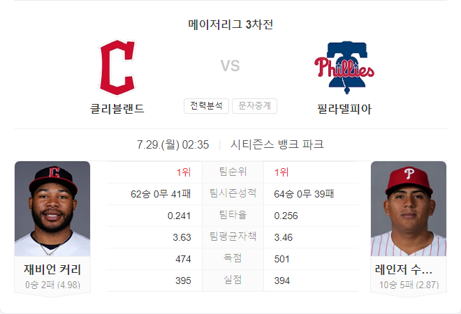 7월 29일 MLB 클리블랜드 가디언스 VS 필라델피아 필리스 타카짱의 경기 예측 분석