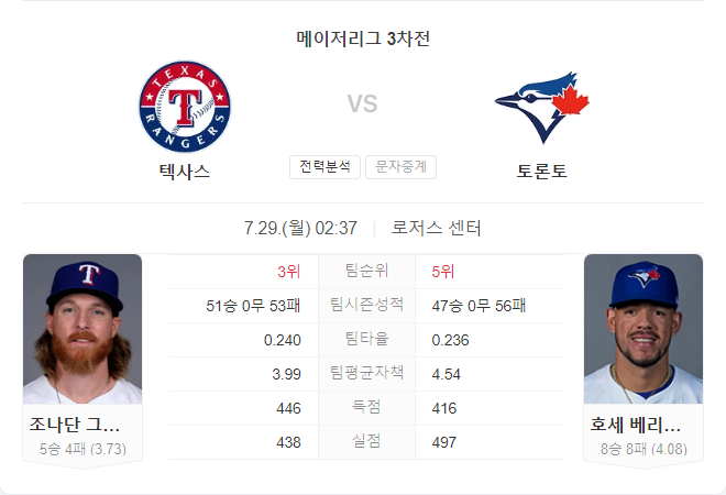 7월 29일 MLB 텍사스 레인저스 VS 토론토 블루제이스 타카짱의 경기 예측 분석