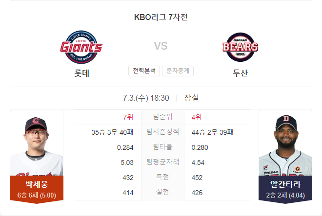 이번 경기는 롯데 자이언츠와 두산 베어스 간의 치열한 접전이 예상됩니다. 롯데 자이언츠는 최근 상승세를 타고 있으며, 특히 박세웅의 안정된 피칭이 팀에 큰 도움이 될 것입니다. 반면, 두산 베어스는 최근 경기에서 기복 있는 모습을 보이고 있으며, 알칸타라의 피칭이 불안정한 상황입니다.
