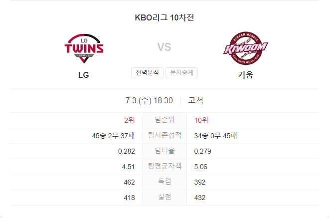 키움 히어로즈는 최근 상승세를 타고 있지만, LG 트윈스의 견고한 투수진을 상대로는 다소 어려움을 겪을 가능성이 큽니다. 따라서 이번 경기는 LG 트윈스가 5-3으로 승리할 가능성이 높습니다.