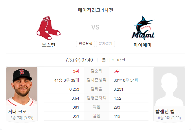 7월 3일 MLB 보스턴 레드삭스 VS 마이애미 말린스 타카짱의 경기 예측 분석