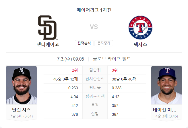 반면, 텍사스 레인저스의 선발 투수 네이선 이오발디는 최근 5경기에서 홈런을 허용하는 등 부진한 모습을 보이고 있습니다. 최근 3경기에서는 16이닝 동안 11점을 허용했습니다. 따라서, 샌디에이고 파드리스가 이 경기에서 승리할 가능성이 높습니다.