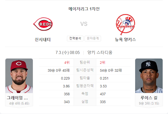 이번 경기는 뉴욕 양키스가 우세할 것으로 보입니다. 레즈의 선발 투수 애쉬크래프트는 최근 부진한 성적을 보이고 있으며, 양키스의 강력한 타선을 막아내기 어려울 것으로 예상됩니다. 반면, 양키스의 선발 투수 길은 홈 경기에서 안정적인 모습을 보이고 있으며, 레즈의 타선을 효과적으로 억제할 것으로 보입니다.