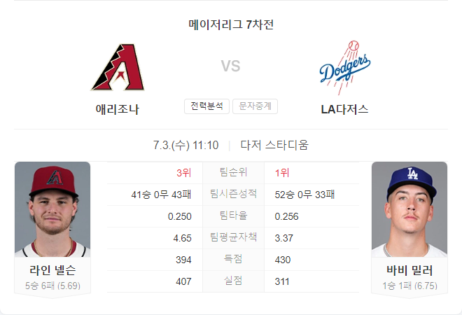 다저스의 밀러가 홈 경기에서 강한 모습을 보이고 있으며, 다이아몬드백스의 넬슨이 다저스를 상대로 좋은 성적을 기록한 점을 고려할 때, 이번 경기는 팽팽한 승부가 될 것으로 예상됩니다. 다이아몬드백스가 최근 타선에서 상승세를 보이고 있지만, 다저스의 강력한 타선과 투수진을 감안할 때 다저스가 유리한 위치에 있다고 판단됩니다.