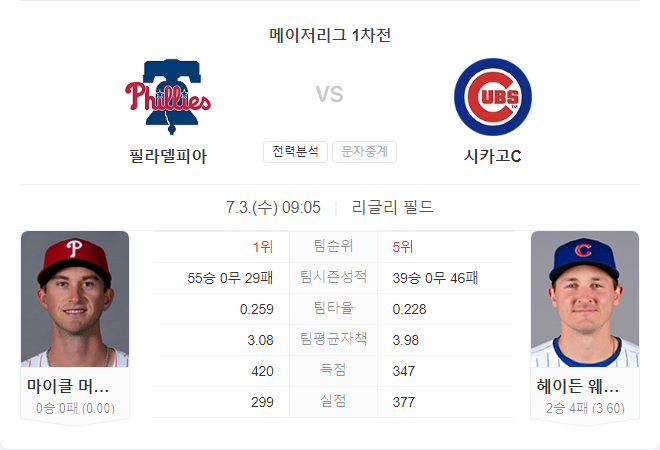 양 팀 불펜을 비교하면, 필리스가 리그 5위의 불펜 ERA를 기록하며 컵스(20위)보다 우위를 점하고 있습니다. 따라서 필리스가 초반에 경기를 유리하게 이끌어 나간다면, 불펜의 도움으로 승리를 가져갈 가능성이 높습니다.