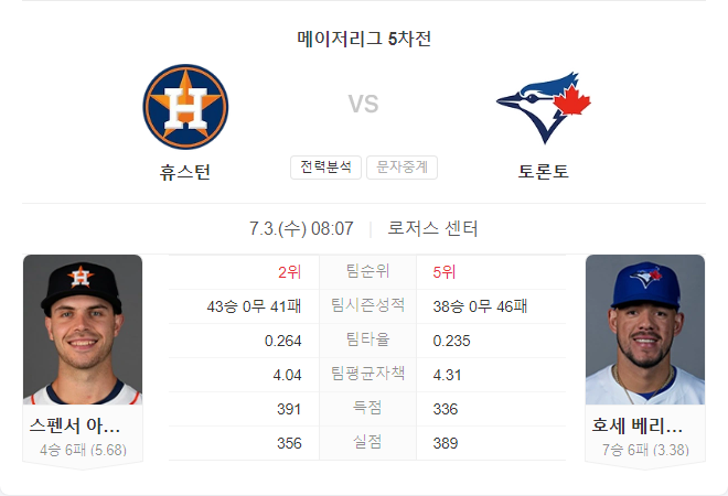 이번 경기는 휴스턴 애스트로스가 유리할 것으로 보입니다. 애스트로스는 최근 상승세를 타고 있으며, 특히 스펜서 아리게티가 최근 두 경기에서 좋은 모습을 보였습니다. 반면, 토론토 블루제이스는 주요 선수들의 부상과 부진으로 어려움을 겪고 있으며, 블라디미르 게레로 주니어의 출전 여부도 불확실합니다.