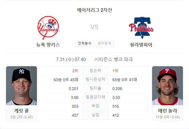 게릿 콜은 최근 경기에서 구속 문제와 피홈런 문제로 고전하고 있으며, 필라델피아의 강력한 타선을 상대로 어려움을 겪을 가능성이 높다. 반면, 에런 놀라는 이번 시즌 꾸준히 안정적인 성적을 거두고 있으며, 양키스 타선을 효과적으로 제어할 수 있을 것이다. 따라서 필리스가 승리할 가능성이 높다.