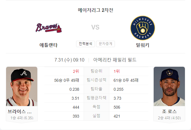 양 팀 모두 최근 불안정한 모습을 보였지만, 애틀랜타 브레이브스는 최근 메츠를 상대로 반등의 기회를 잡았다. 브레이브스의 불펜이 더 안정적이며, 타선도 최근 좋은 모습을 보이고 있다. 밀워키 브루어스는 최근 말린스와의 경기에서 부진한 모습을 보였으며, 타선에서도 큰 힘을 발휘하지 못하고 있다. 따라서 이번 경기는 애틀랜타 브레이브스가 승리할 가능성이 높다.