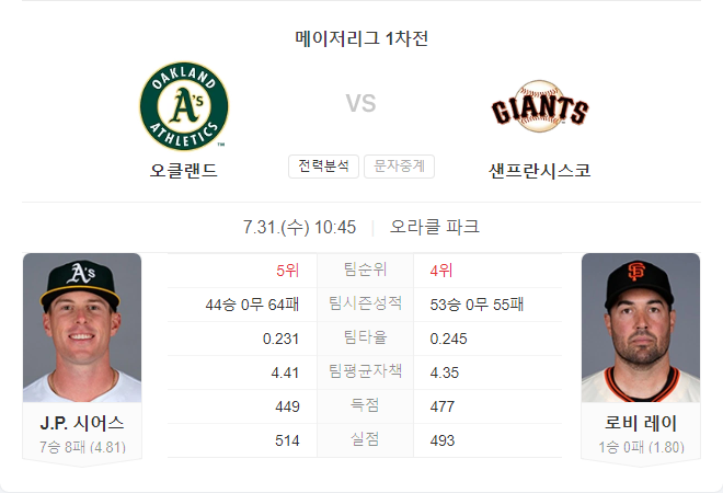 오클랜드 어슬레틱스는 최근 타격에서 강한 모습을 보이고 있지만, JP 시어스의 부진한 성적과 불안정한 투수진으로 인해 이번 경기는 어려울 것으로 예상됩니다. 반면, 샌프란시스코 자이언츠는 로비 레이가 안정적인 투구를 이어가며 홈에서의 강한 경기력을 보여줄 것으로 기대됩니다. 자이언츠가 이번 경기에서 승리할 가능성이 높습니다.
