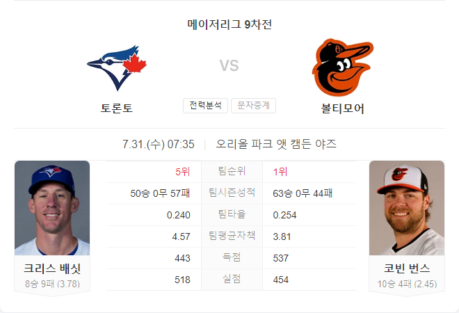 토론토는 최근 경기에서 타선과 투수진 모두 약점을 보이며 고전하고 있다. 반면, 볼티모어는 강력한 타선과 안정적인 투수진을 바탕으로 경기를 지배할 것으로 예상된다. 코빈 번스는 이번 시즌 꾸준히 좋은 성적을 거두고 있으며, 이번 경기에서도 좋은 활약을 기대할 수 있다.