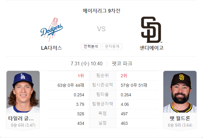 타일러 글래스나우는 최근 부진한 성적을 기록했지만, 샌디에이고를 상대로는 좋은 투구를 보여주었습니다. 반면 맷 월드론은 다저스를 상대로 안정적인 투구를 펼쳤지만, 팀 타선의 지원을 받지 못했습니다. 다저스와 파드리스 모두 최근 타격력이 좋으며, 불펜 또한 안정적이지 않습니다. 하지만 글래스나우의 최근 부진과 파드리스의 홈 경기 강점을 고려할 때, 파드리스가 승리할 가능성이 높습니다.