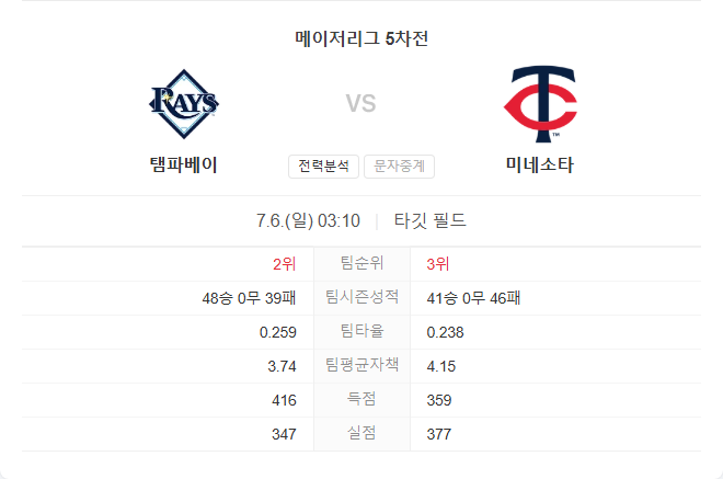 탬파베이는 선발 브래들리의 부진과 더불어 득점권 기회 활용의 부족이 문제로 작용하고 있습니다. 미네소타는 불안한 선발을 앞세우지만 최근 타선의 활약과 홈 이점을 바탕으로 경기 후반 흐름을 잡을 가능성이 큽니다. 특히 해리슨 베이더를 중심으로 한 장타력과 불펜의 안정감이 유리하게 작용할 전망입니다. 접전이 예상되나 미네소타의 연승 분위기와 홈 경기 이점이 승부처가 될 것입니다.