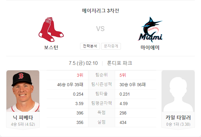 이번 경기는 보스턴 레드삭스가 유리할 것으로 예상됩니다. 레드삭스는 최근 좋은 경기력을 보이며, 강력한 타선을 바탕으로 마이애미 말린스를 압도할 가능성이 높습니다. 반면, 말린스는 타선의 부진과 함께 투수진에서도 불안한 모습을 보이고 있어 승리하기 어려울 것으로 보입니다.