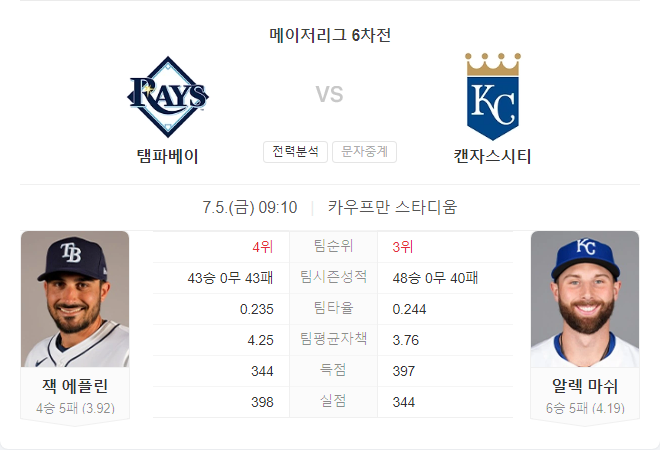 7월 5일 MLB 탬파베이 레이스 VS 캔자스시티 로열스 타카짱의 경기 예측 분석