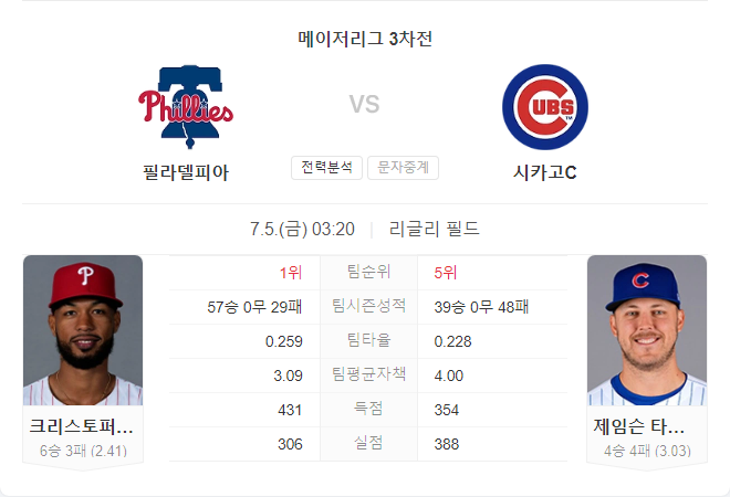 이번 경기는 필라델피아 필리스가 유리할 것으로 예상됩니다. 필리스는 최근 좋은 경기력을 보이며 강력한 타선과 안정적인 투수진을 바탕으로 승리를 가져갈 가능성이 큽니다. 반면, 시카고 컵스는 최근 부진한 모습을 보이며, 타이온의 불안한 투구가 경기에 영향을 미칠 수 있습니다. 필리스가 경기를 주도하며 승리를 거둘 가능성이 높습니다.