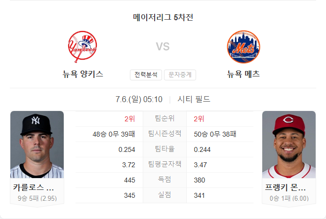 양키스는 최근 4연패에 빠지며 아메리칸리그 동부 선두 자리를 토론토와 공유하게 되었습니다. 직전 경기에서는 블루제이스에게 8-5로 패하며 시리즈 스윕을 허용했습니다. 이번 경기에 선발로 나서는 카를로스 로돈은 시즌 9승 5패, 평균자책점 2.95, WHIP 1.00을 기록 중이며, 원정 경기에서는 2.67의 평균자책점을 보이고 있습니다. 메츠와의 맞대결에서도 한 차례 승리를 거둔 바 있으며, 최근 5경기 중 4경기에서 팀이 패했지만 개인 투구 내용은 안정적이었습니다.