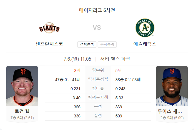 자이언츠는 웹의 선발 호투 가능성과 맞대결 전적 우위가 강점입니다. 반면 애슬레틱스는 타선이 극도로 부진하고 세베리노의 최근 흔들림이 심해 경기 흐름을 가져오기 어려울 전망입니다. 경기 전반 웹의 피칭으로 자이언츠가 리드를 가져가며, 중후반에도 그 흐름을 이어갈 것으로 보입니다.