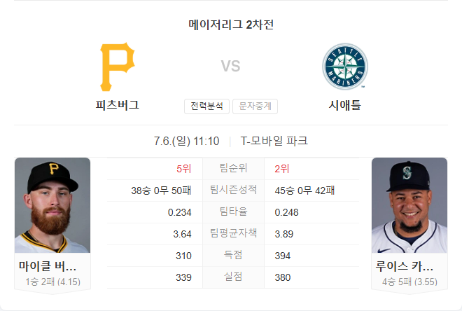 7월 6일 MLB 메이저리그 피츠버그 파이어리츠 VS 시애틀 매리너스 타카짱의 경기 예측 분석