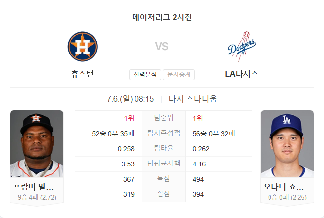 애스트로스는 타선 폭발력과 발데즈의 안정적인 투구에 이어 공·수 전반에서 압도적인 우위를 보이고 있습니다. 다저스는 오타니의 선발 등판이었지만 금요일과 같은 대패의 충격을 떨치기 어려울 것으로 보이며, 타선과 불펜 모두 아직 반등하지 못한 상태입니다. 특히 6회 이후 중·후반 불펜 싸움에서도 애스트로스가 우위를 점할 것으로 예상됩니다.