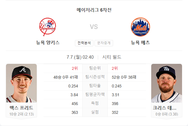 프리드는 시즌 내내 에이스다운 안정적인 모습으로 팀의 기대를 받고 있습니다. 반면 메츠는 오프너 중심의 묘수를 준비했지만, 깊은 이닝을 책임질 선발 투수가 없는 상황입니다. 양키스가 프리드의 호투를 기반으로 초반 주도권을 잡고, 불펜 승부에서는 양키스가 우위를 점할 가능성이 높습니다.