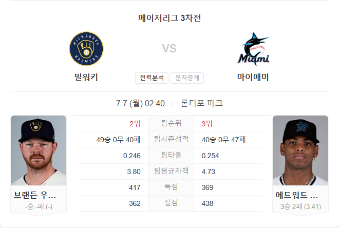브루어스는 최근 2연패 뒤 시리즈 1차전에서 말린스를 상대로 승리를 거두며 분위기 반등에 성공했습니다. 팀은 49승 39패로 NL 중부 2위이며, 시즌 평균 4.72득점으로 리그 8위 공격력을 유지 중입니다. 타율은 .246(16위), 출루율 .322(13위), 장타율 .382(21위)로 안정적인 반면 불펜진은 평균자책 3.79(14위), WHIP 1.28(18위)로 중위권 성적을 기록 중입니다. 크리스티안 옐리치(17홈런·61타점)가 중심축 역할을 하고 있으며, 샐 프렐릭(.292 타율)이 타선을 이끌고 있습니다. 선발 브랜든 우드러프는 이번 시즌 첫 등판 예정이며, 2023시즌 5승 1패 ERA 2.28의 성적을 기록했고 말린스 상대로는 4경기 3승 무패 ERA 2.77로 강한 면모를 보였습니다.
