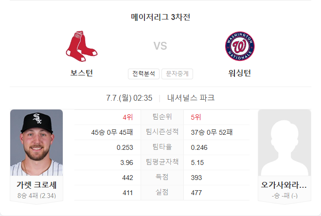 크로셰는 시즌 내내 안정적인 투구를 선보이며, 워싱턴 타선을 효과적으로 제압할 가능성이 높습니다. 반면 내셔널스는 선발이 급히 교체된 데다 데뷔 등판 변수까지 있어 초반 실점 위험이 큽니다. 타선에서도 보스턴이 최근 데뷔한 이적 및 영입 선수들의 상승세도 지속 중이라, 흐름을 이어갈 것으로 예상됩니다.