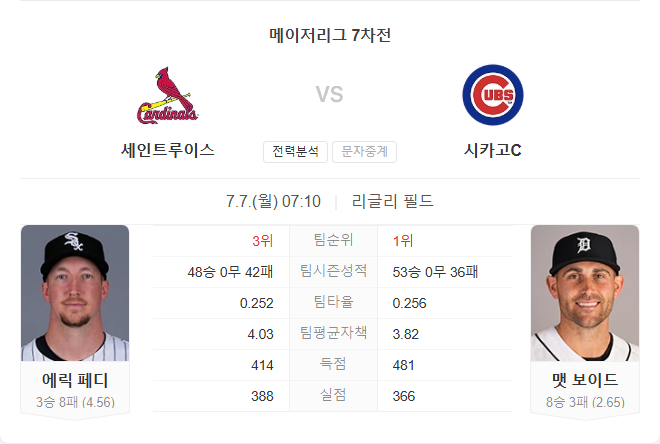 컵스는 토요일 경기에서 8개의 홈런을 기록한 프랜차이즈 신기록에도 불구하고 8-11로 패하며 시리즈 첫 승을 내주었습니다. 현재 53승 36패로 중부 1위이며, 매튜 보이드는 8승 3패, ERA 2.65, WHIP 1.084로 안정적인 시즌을 보내고 있습니다. 지난 등판(가디언스전)에서 7이닝 2실점으로 승리를 챙겼으며, 최근 3경기에서는 ERA 2.00으로 호투 중입니다. 커리어 카디널스 상대 기록도 2승 1패, ERA 1.57로 강한 모습을 유지하고 있습니다.