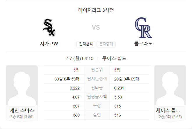 7월 7일 MLB 메이저리그 시카고 화이트삭스 VS 콜로라도 로키스 타카짱의 경기 예측 분석