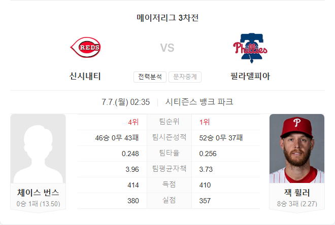 7월 7일 MLB 메이저리그 신시내티 레즈 VS 필라델피아 필리스 타카짱의 경기 예측 분석