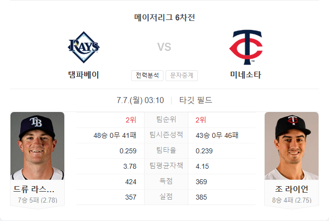 7월 7일 MLB 메이저리그 탬파베이 레이스 VS 미네소타 트윈스 타카짱의 경기 예측 분석