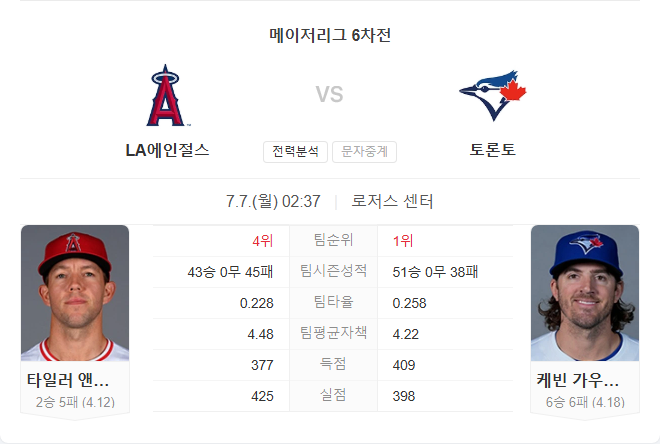 블루제이스는 최근 9경기에서 8승을 기록하며 상승세를 이어가고 있습니다. 프라이데이에는 마일스 스트로가 투수 실수로 홈에 들어오는 엔딩 플레이를 완성하며 4-3 승리를 거뒀습니다. 시즌 성적은 50승 38패로 AL 동부 1위를 유지 중입니다. 선발 케빈 거스만은 6승 6패, 평균자책점 4.18, WHIP 1.111로 시즌을 보내고 있으며, 직전 등판에서는 5이닝 2실점, 3탈삼진을 기록했습니다. 에인절스전 커리어는 6승 3패, 3.65 ERA이며 로저스 센터에서는 4.16 ERA를 기록했습니다.