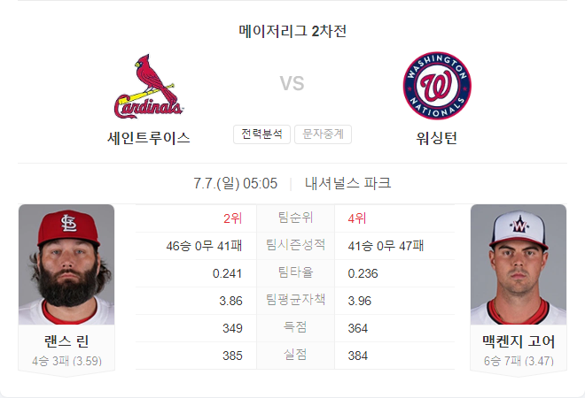 7월 7일 MLB 세인트루이스 카디널스 VS 워싱턴 내셔널스 타카짱의 경기 예측 분석