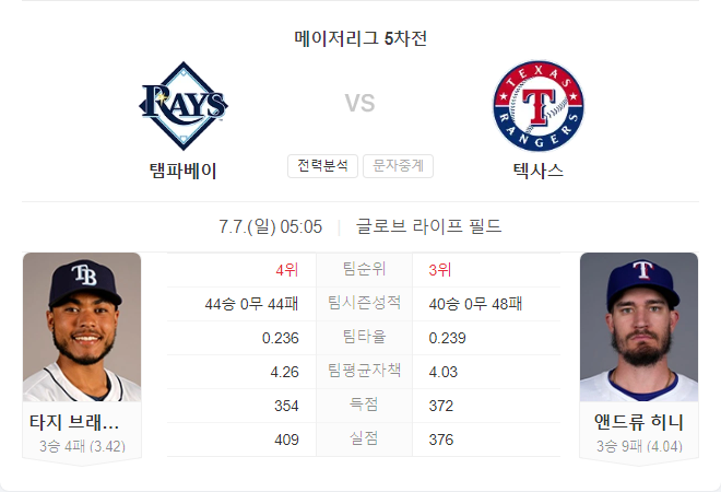 탬파베이 레이스가 이번 경기에서 우세할 것으로 예상됩니다. 레이스는 브래들리의 안정적인 투구와 함께 최근 좋은 성적을 기록하고 있습니다. 반면, 텍사스 레인저스는 최근 성적이 좋지 않고, 앤드류 히니 역시 템파베이를 상대로 어려움을 겪은 바 있습니다. 따라서 탬파베이 레이스가 이번 경기에서 승리할 가능성이 높습니다.