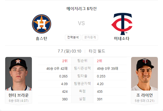 이번 휴스턴 애스트로스와 미네소타 트윈스의 경기는 양 팀의 강력한 선발 투수와 타선의 대결이 될 것으로 예상됩니다. 애스트로스는 브라운의 안정적인 투구와 알바레즈, 알투베를 중심으로 한 강력한 타선을 바탕으로 경기를 이끌 가능성이 큽니다.