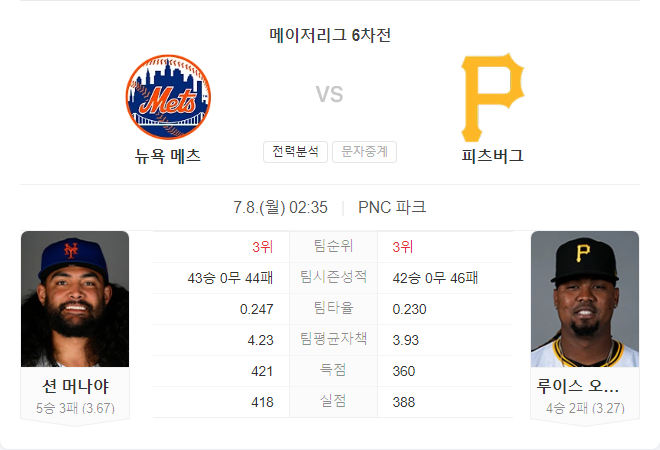 뉴욕 메츠는 최근 흐름이 좋지 않지만, 피츠버그 파이어리츠의 투수진이 불안정한 모습을 보이고 있어 이번 경기에서 뉴욕 메츠가 승리할 것으로 예상됩니다.